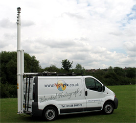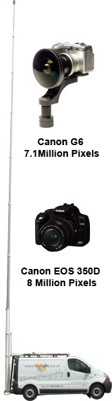 Highpix photography currently uses a 7.1 million pixel Canon G6 and a 8 million pixel Canon EOS 350D camera fitted to a remotely controlled pan and tilt head. This is then mounted on a telescopic mast which extends to any height from 2.5m (8’) to 25m (82’) using compressed air provided by a compressor.